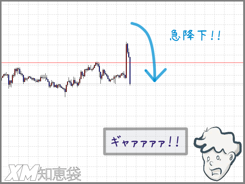 しばらくすると急激な下げが収まり、一度価格が上に戻ってきます。(
