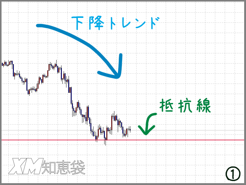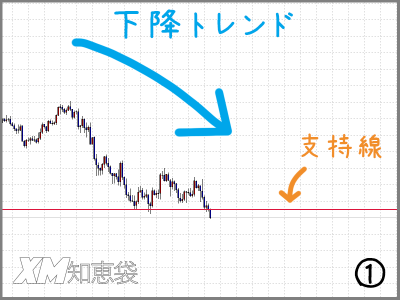 上の画像では最初に下降のトレンドが続いていくと分析しました。(