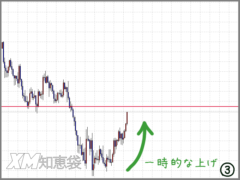 予想通り、赤色の水平線を超えて価格が一度大きく下がります。(