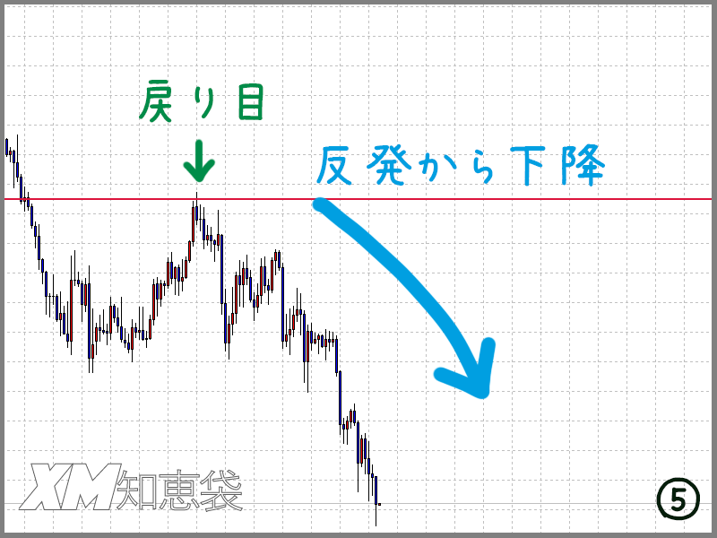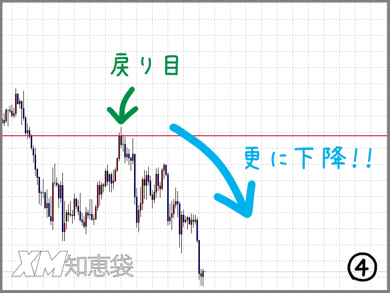 戻り目とは押し目と反対に、価格が下降していく途中で一時的に上げるものの、再びの下げる形のことである。